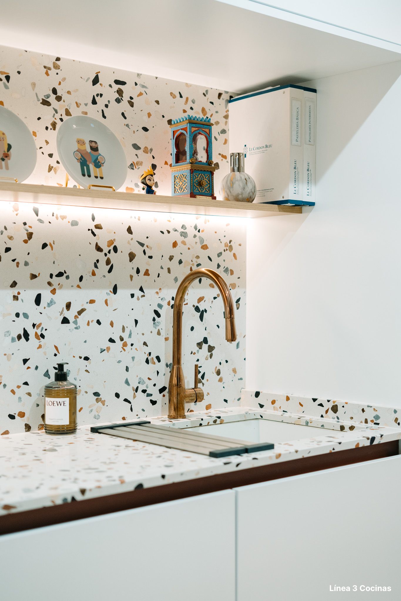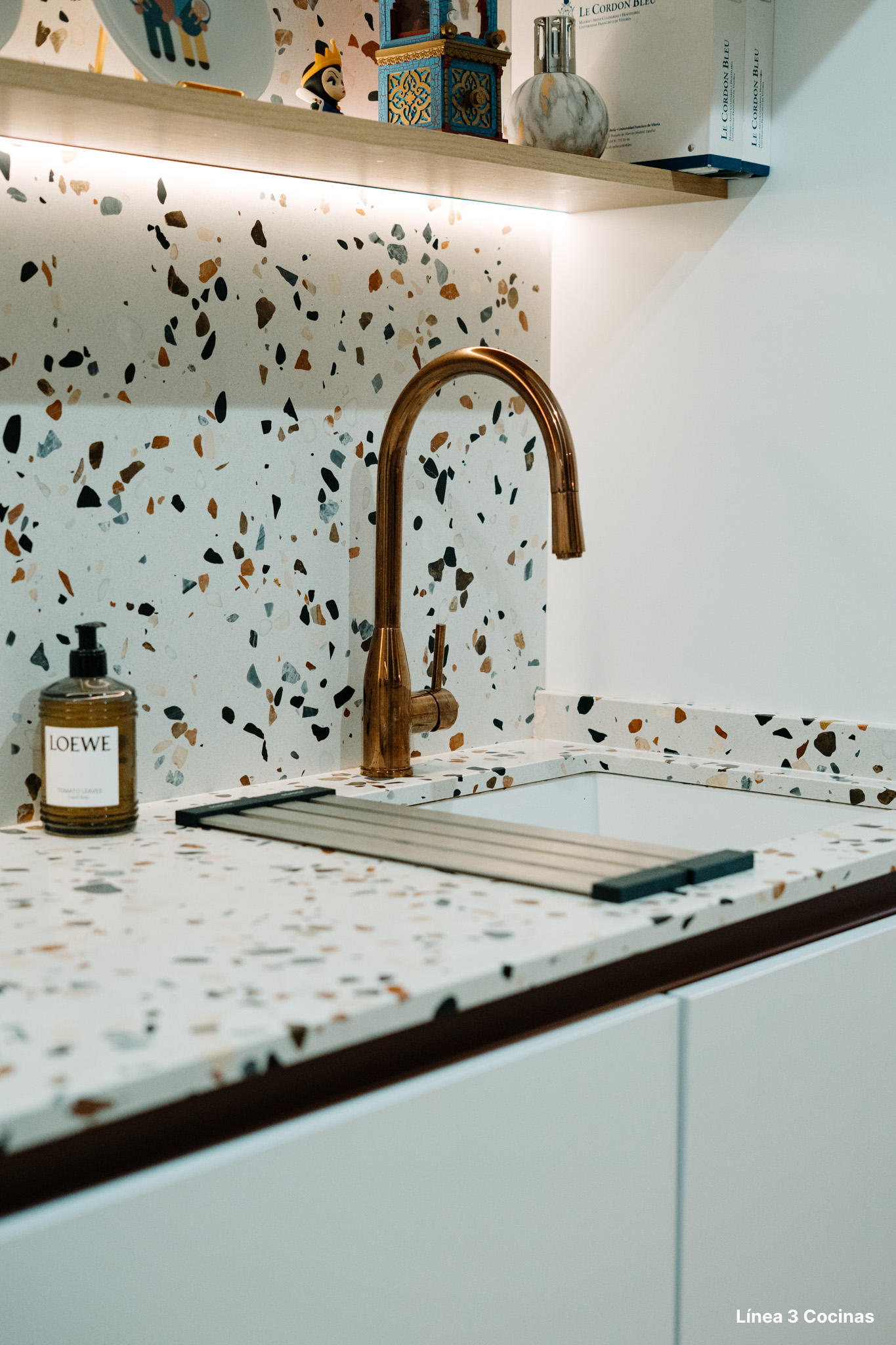 El fregadero integrado es el Schock Veravent Brooklyn N100L en Superwhite, un modelo instalado bajo encimera en material Cristalite+. Un material que resiste el impacto, las manchas y los cambios de temperatura mejor que el acero convencional. Junto a él, el grifo Schock Kavus en acabado cobre se convierte en el único punto de calor cromático de la cocina.