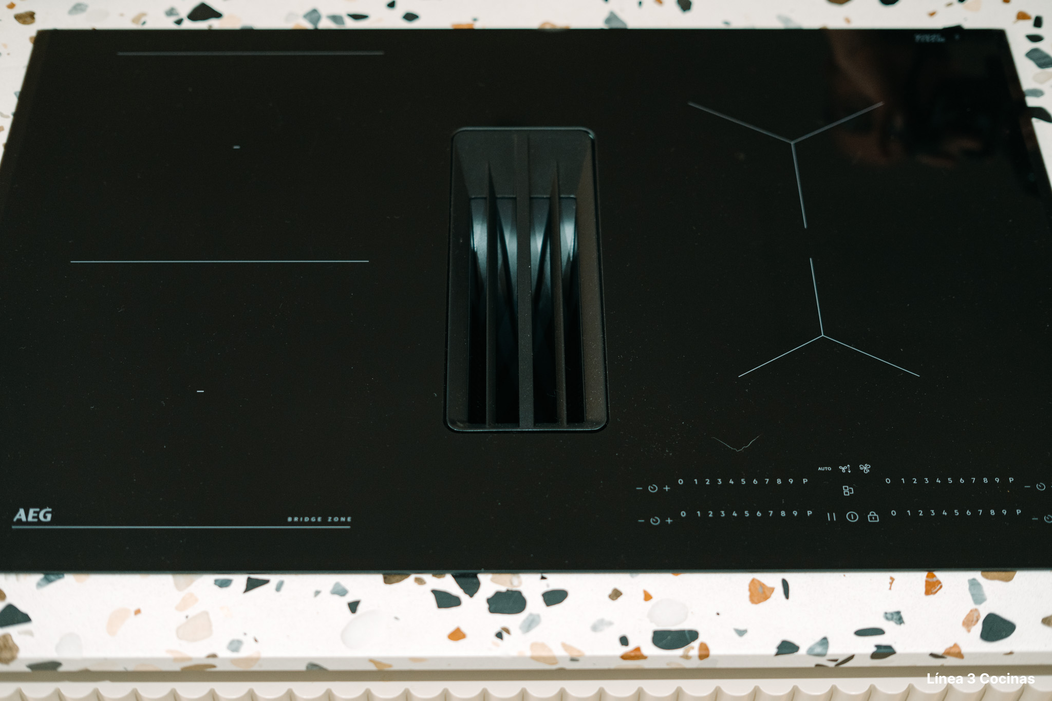 Los controles son tipo Slider individuales con temporizador Eco por zona, y la función Bridge permite usar el puente central para piezas de gran formato. El resultado visual es una encimera sin interrupciones verticales: el campo de cocción se funde con la superficie y la extracción desaparece.