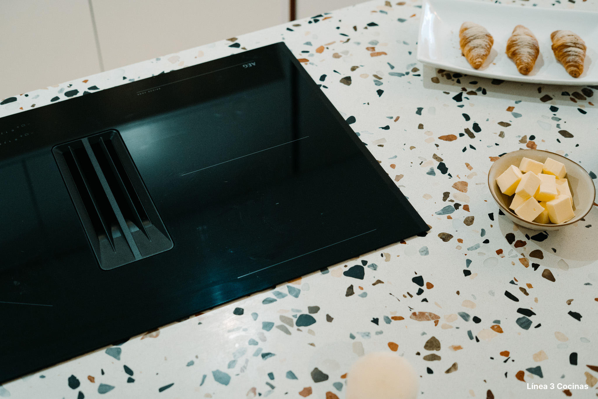 La solución fue una placa de inducción de AEG de 80 cm de la Serie 6000 con campana integrada en la propia superficie. Sin estructura colgante. Sin obstáculo a la altura de la vista. La extracción ocurre directamente en la placa.