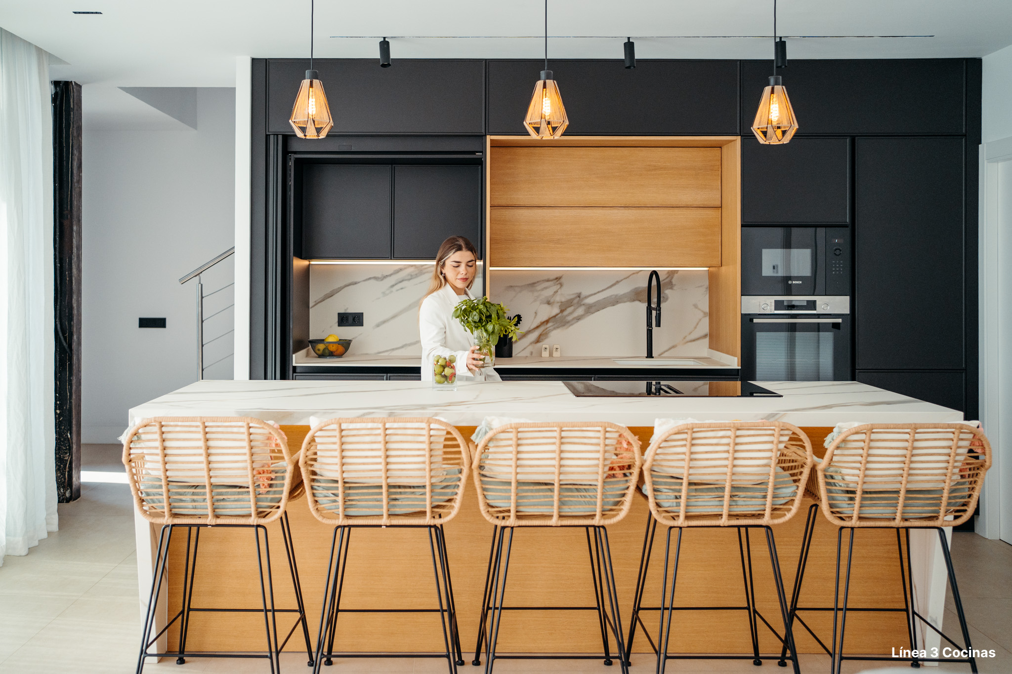 Las formas curvas reemplazan la rigidez geométrica. Islas con perímetros redondeados, detalles curvos que eliminan aristas, facilitando la circulación y aportando una cualidad escultórica al espacio. Estas soluciones son especialmente valoradas en cocinas abiertas al salón o a la entrada, donde la cocina mantiene contacto visual con áreas sociales.